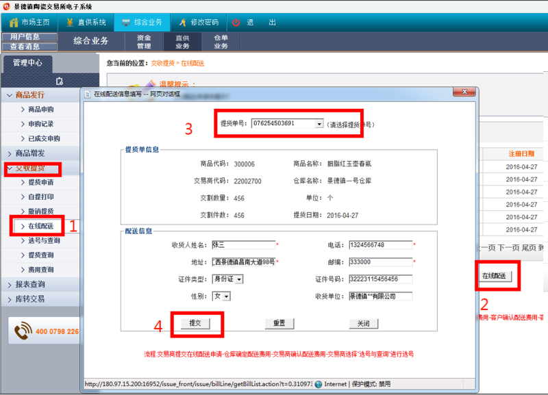交收提貨---在線配送---在線配送---選擇提貨單號(hào)提交
