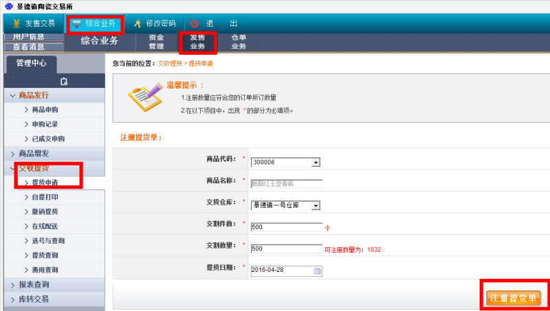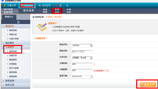 客戶端---綜合業(yè)務(wù)---發(fā)售業(yè)務(wù)---交收提貨---注冊提貨單