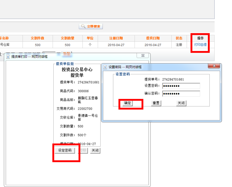 綜合業(yè)務(wù)---發(fā)售業(yè)務(wù)---交收提貨---自提打印,設(shè)定提貨密碼、打?。?/span>