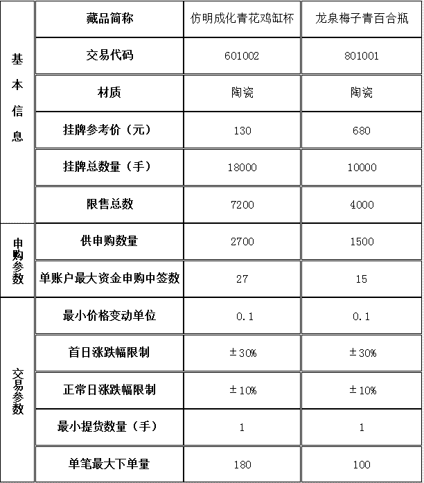經(jīng)景德鎮(zhèn)陶瓷交易所有限公司(以下稱本交易所)發(fā)行人會員申請,本交易所專家委員會、新藏品掛牌審核小組評估審核通過,對已經(jīng)完成托管入庫的2只藏品《仿明成化青花雞缸杯》 、《龍泉梅子青百合瓶》準(zhǔn)予在本交易所線上實物交易系統(tǒng)正式掛牌交易,具體事項公告如下: