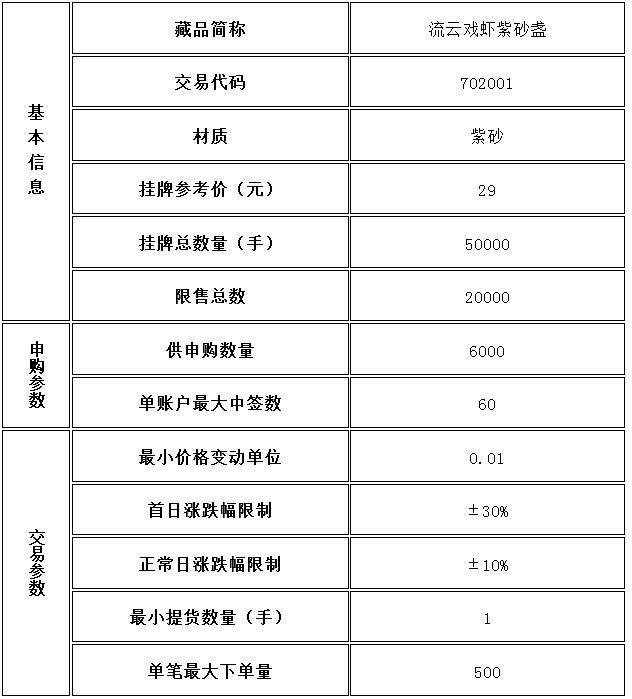 經(jīng)景德鎮(zhèn)陶瓷交易所有限公司(以下稱(chēng)本交易所)發(fā)行會(huì)員申請(qǐng),本交易所專(zhuān)家委員會(huì)、新藏品掛牌審核小組評(píng)估審核通過(guò),對(duì)已經(jīng)完成托管入庫(kù)的藏品《流云戲蝦紫砂盞》準(zhǔn)予在本交易所線上實(shí)物交易系統(tǒng)正式掛牌交易,具體事項(xiàng)公告如下: