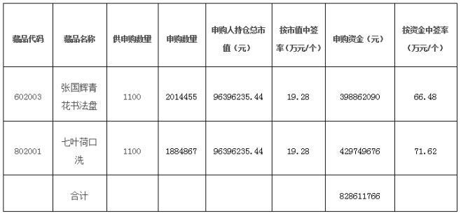 本次中簽分配方式為45.45%按持倉(cāng)市值分配,54.55%按申購(gòu)資金分配,請(qǐng)廣大參與申購(gòu)的交易會(huì)員關(guān)注交易賬號(hào)中持倉(cāng)數(shù)量和資金變化情況。《張國(guó)輝青花書(shū)法盤(pán)》、《七葉荷口洗》將于2017年4月8日正式掛牌交易。
