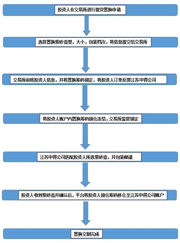 為了保護(hù)線上投資人的利益,促進(jìn)線上線下的流通,江蘇中得文化發(fā)展有限公司聯(lián)合景德鎮(zhèn)陶瓷交易所(以下簡稱陶交所)將推出“線上泥料藏品置換”活動(dòng)。持有(編號(hào)501001)黃龍山紫泥鯊皮青、(編號(hào)501002)中鼎底槽清紫砂泥藏品的投資人申請(qǐng)?zhí)嶝洉r(shí)可以選擇直接提取紫砂泥料,也可以與線上泥料制作的紫砂器物進(jìn)行籌碼置換。