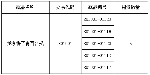 2018015關(guān)于交易藏品《龍泉梅子青百合瓶》提貨公告